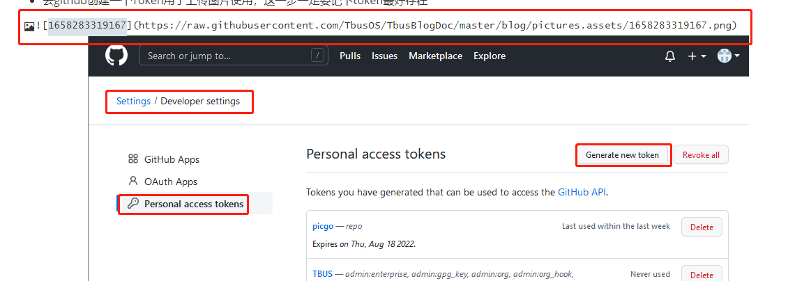 - 去github创建一个Token用于上传图片使用,这一步一定要记下token最好存在
